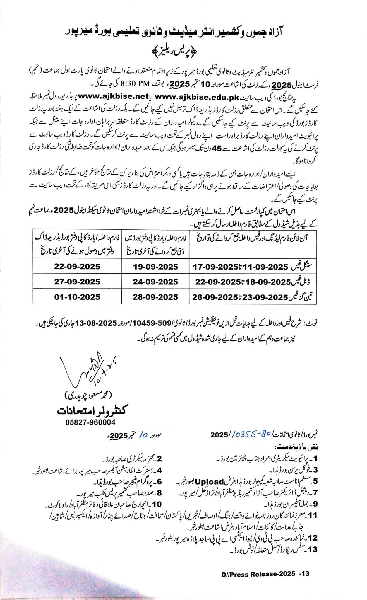 AJK Bise Mirpur Board 9th Class Result 2025 has been Announced on Today 10 September 2025 at 08:00 PM. The AJK BISE Mirpur Board 9th Class Result 2025 has officially been announced, bringing an end to the long wait for thousands of students across Azad Jammu and Kashmir. The students of SSC Part 1 can now check their results online through the official website of the Board of Intermediate and Secondary Education (BISE) Mirpur AJK.